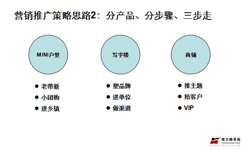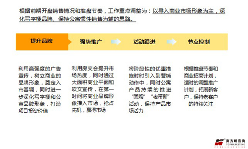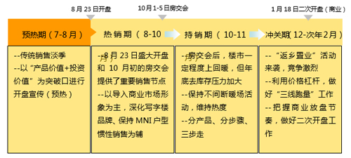 营销策略:根据开盘销售情况和推盘节奏,结合房交会重要销售节点,工作重点调整为:以导入商业市场形象为主,深化写字楼品牌、保持MNI户型惯性销售为辅的思路
