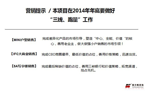 营销策略:核心在于对客户需求的把握,细节的项目展示和氛围营造,巧妙的价格杠杆应用、有效的开盘控制、精准的渠道选择缺一不可,在2014年年底最大限度做好“三线、跑量”工作。